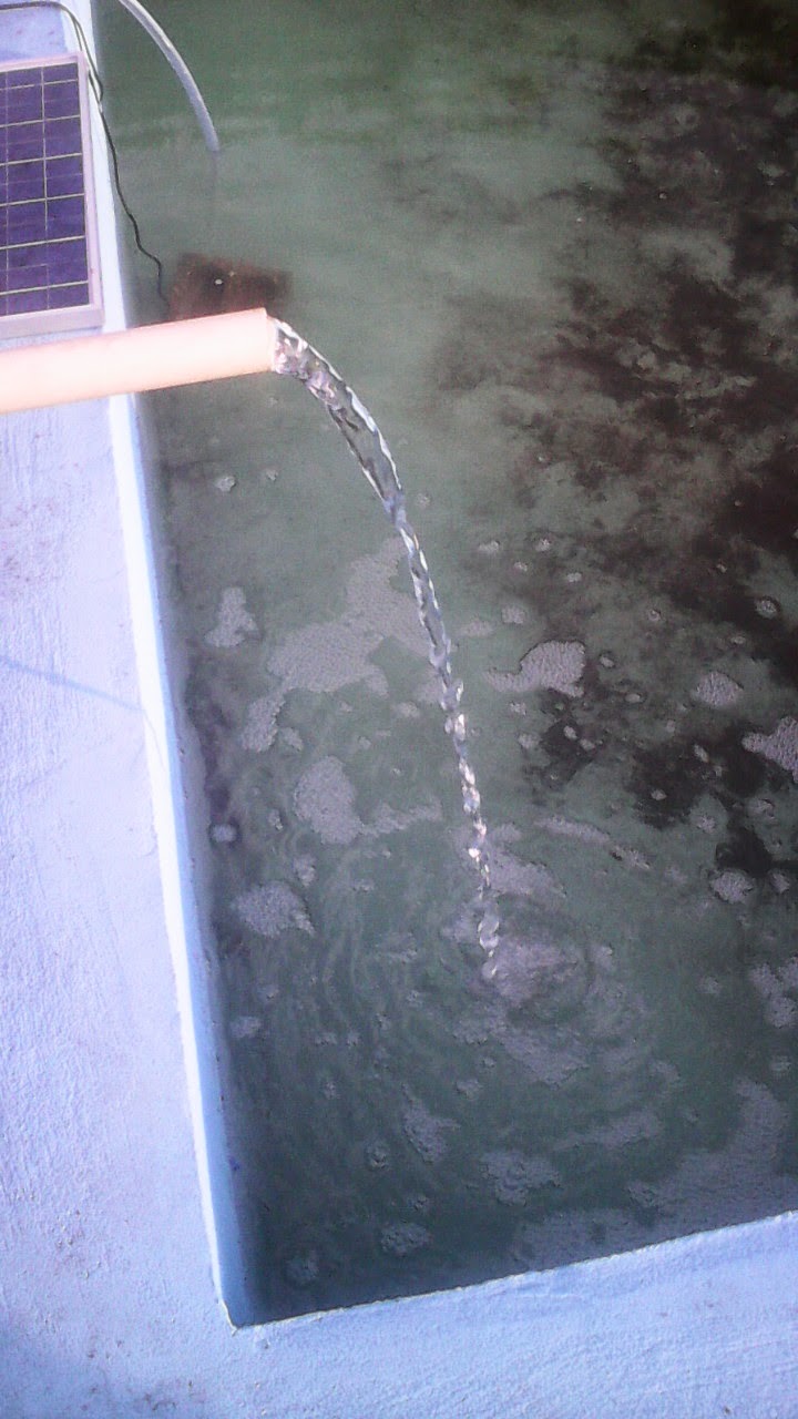A água é elevada através de um sistema solar e nesta fase apenas a 500 litros por hora.